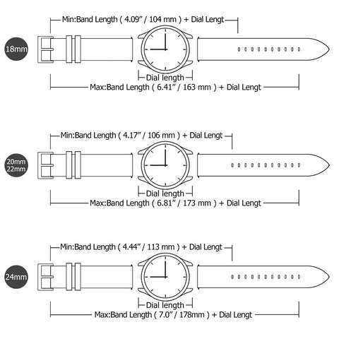Our watch strap can be individualized adjustment to achieve the perfect fit. Two cross-stitched collars allow the ban to be secured. Refined, Durable, and Comfortable all in one. Please measure the strap length as follows